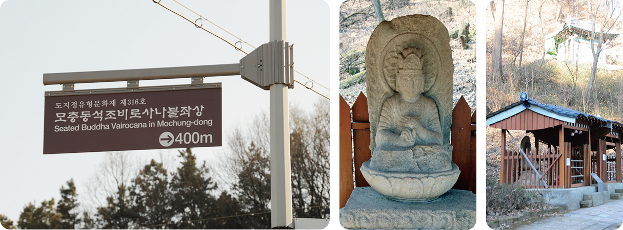 모충동 석조비로자나불좌상은 청화사(淸華寺)가 있던 절터에 있다.